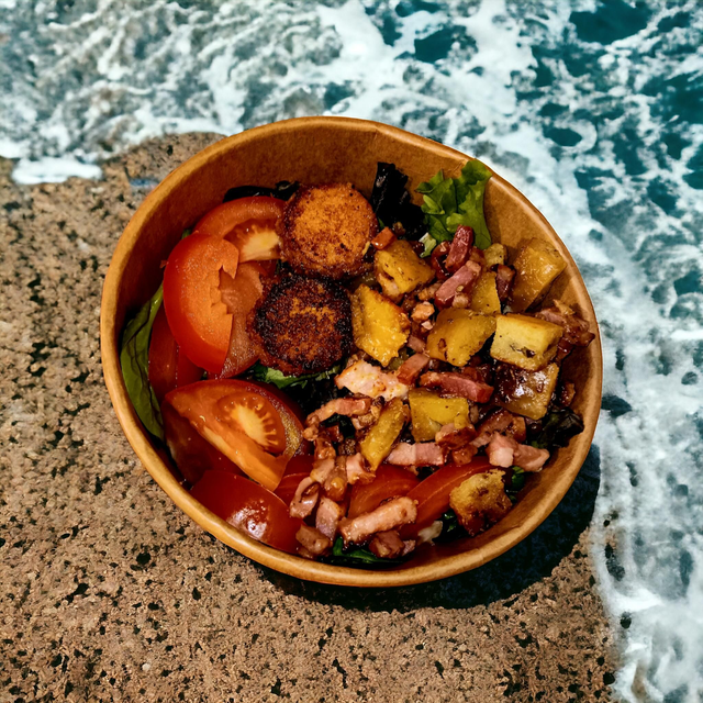 La montagnarde : Pomme de terre, saucisse fumée, lardons, jambon fumée, comté, sauce vinaigrette.